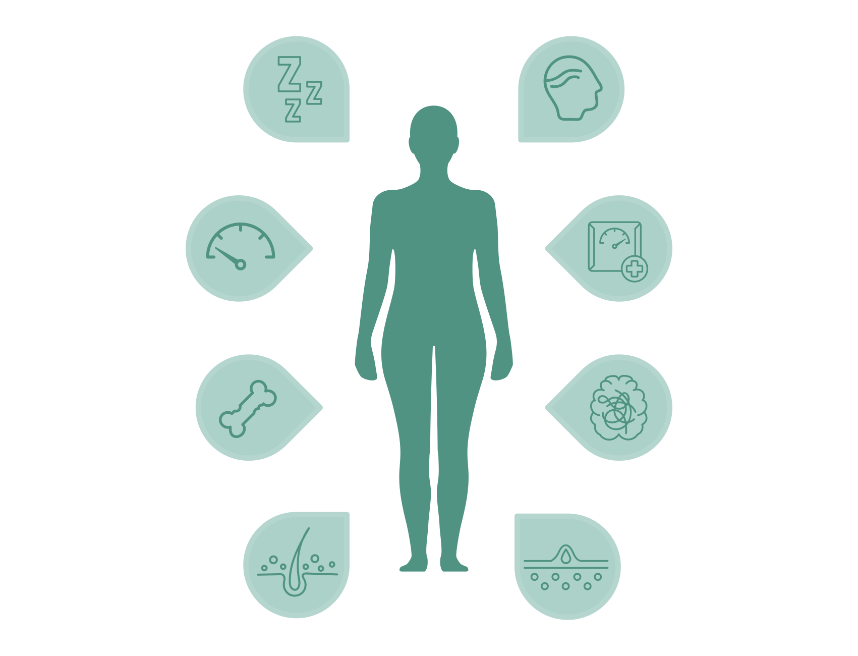 Oestrogen (produced by the ovaries) levels in women vary throughout the lifespan in relation to a woman’s reproductive history. During the menopause, oestrogen levels rapidly decline which can contribute to hot flashes, mood swings, vaginal dryness, hair loss or less hair growth and decline in collagen and skin thickness.