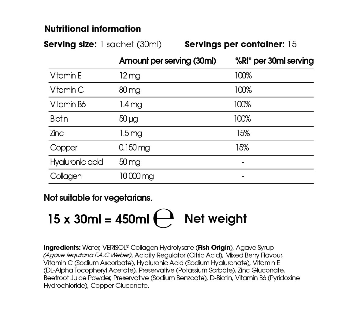 Ingredients: Water, VERISOL® Collagen Hydrolysate (Fish Origin), Agave Syrup (Agave tequilana F.A.C Weber), Acidity Regulator (Citric Acid), Mixed Berry Flavour, Vitamin C (Sodium Ascorbate), Hyaluronic Acid (Sodium Hyaluronate), Vitamin E (DL-Alpha Tocopheryl Acetate), Preservative (Potassium Sorbate), Zinc Gluconate, Beetroot Juice Powder, Preservative (Sodium Benzoate), D Biotin, Vitamin B6 (Pyridoxine Hydrochloride), Copper Gluconate.