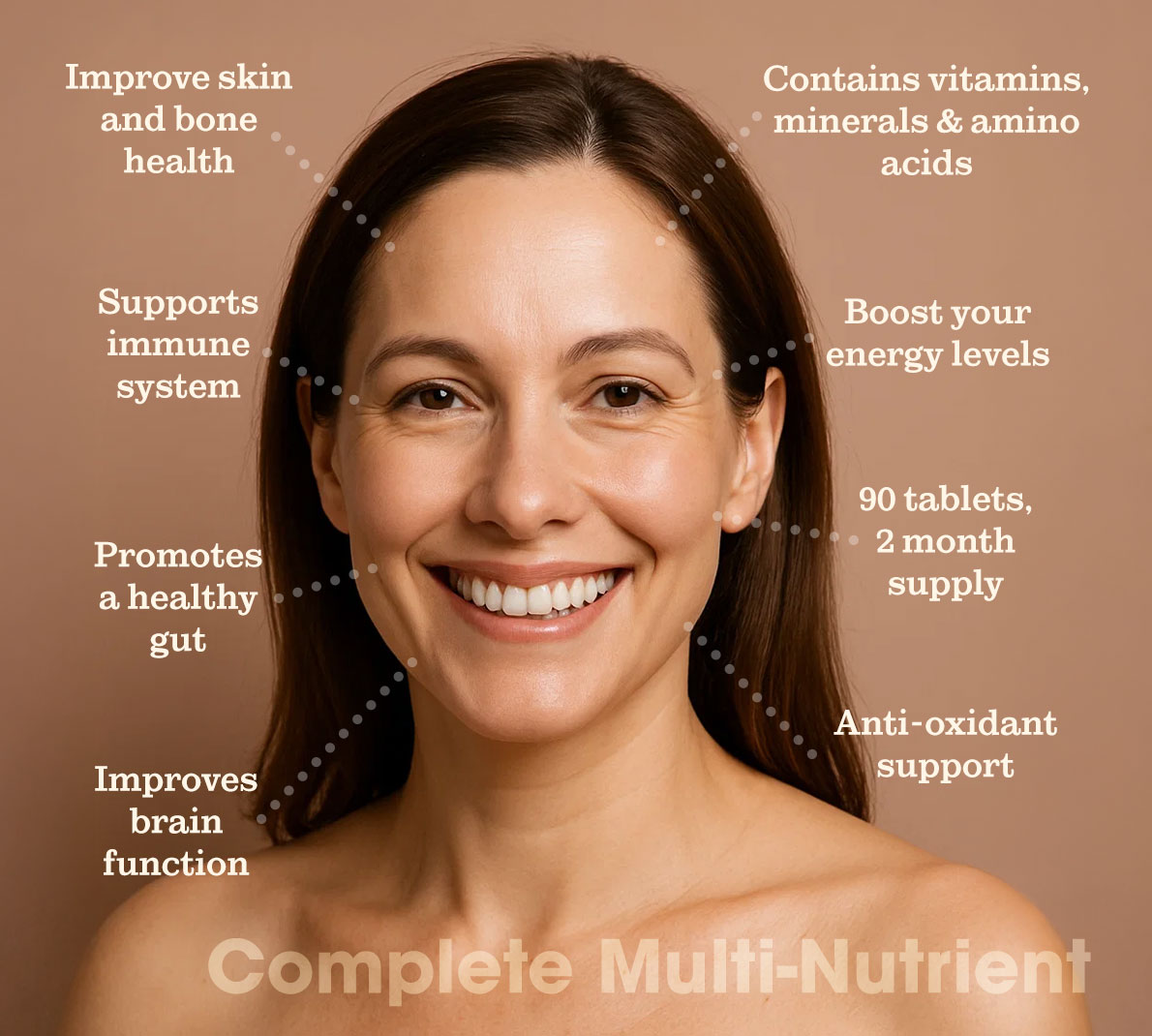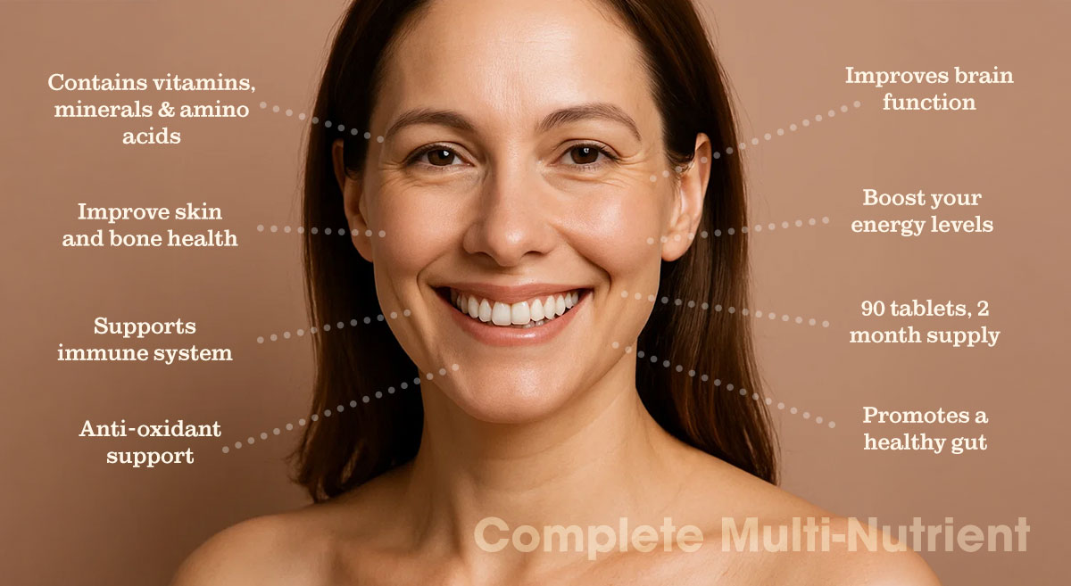 Complete Multi-Nutrient is a comprehensive blend of essential vitamins, minerals, amino acids, probiotics, and plant extracts—formulated to support women navigating the demands of life after 40. From immune health and energy metabolism to skin support and digestive balance, this all-in-one formula helps you feel steady, focused, and well.