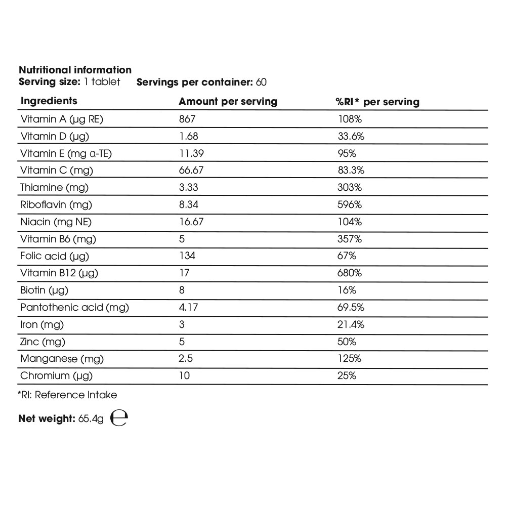 Calcium Carbonate, Rice protein Powder, Anti-caking Agent (Stearic Acid), Calcium Stearate, Vitamin C (Calcium Ascorbate), Anti-caking Agent (Microcrystalline Cellulose), Citric Acid, Anti-caking Agent (Sodium Croscaramellose), Magnesium Oxide, Soy Lecithin, Aloe Vera (Aloe Barbadensis) Inner Fillet Powder, Niacinamide, Potassium Chloride, Vitamin E (D-Alpha Tocopherol), Anti-caking Agent (Silica), Dicalcium Phosphate, Betaine HCL, Acerola Cherry (Malpighia Punicifolia) Fruit Powder, Alfalfa (Medicago Sativa) Aerial Parts Powder, Butternut (Juglans Cinerea) Bark Powder, Cayenne (Capsium Annum) Fruit Powder, Schisandra Chinensis Fruit Extract, Echinacea (Echinacea Angustipholia) Aerial Parts Extract, Fennel (Foeniculum Vulgare) Seed Powder, Fo-ti (Polygonum Multiflorum) Root Powder, Ginger (Zingiber Officinale) Root Powder, Gotu Kola (Hydrocotyle Asiatica) Whole Herb Powder, Parsley (Petroselinum Sativum) Leaf Powder, Papaya (Carica Papaya) Leaf Powder, Red Raspberry (Rubus Idaeus) Fruit Powder, Rice (Oryza Sativa) Bran, Sarsaparilla (Smilax Officinalis) Root Powder, Yellowdock (Rumex Crispus) Root Powder, L-Glutamic Acid HCL, DL-Methionine, Riboflavin, Choline (Bitartrate), PABA (Para Amino Benzoic Acid), Citrus (Bioflavonoids Extract), Phosphorus (DCP), Inositol, Acidophilus (Lactose Free), L-Lysine HCL, Rutin, Zinc Oxide, Pyridoxine HCL, L-Arginine HCL, Pantothenic Acid (D-Calcium Pantothenate), Thiamine HCL, Iron (Ferrous Fumarate), Manganese (Sulfate), Hesperidin (Bioflavonoids Extract), Astragalus (A Membranaceus) Root Extract, Artichoke (Cynara Scolymus) Leaf extract, Trace Minerals Complex, Astaxanthin, Grape (Vitis Vinifera) Seed Extract, Vitamin A (Beta Carotene), Vitamin A (Palmitate), Bilberry (Vaccinium Myrtillus) Fruit Extract, Peppermint (Mentha Piperita) Leaf Powder, Wintergreen (Gaultheria Procumbens) Leaf Powder, Gingko Biloba Leaf Extract, Folic Acid, Vitamin B12 (Cyanocobalamin), Octacosanol, Sodium Selenite, Chromium Picolinate, D-Biotin, Vitamin D3.